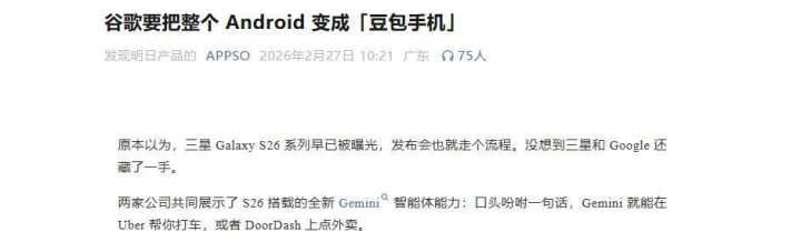 半年后,Google在三星Galaxy S26发布会上亮出了一个功能:对Gemini说一句话,它帮你在Uber打车,概况在DoorDash点外卖。