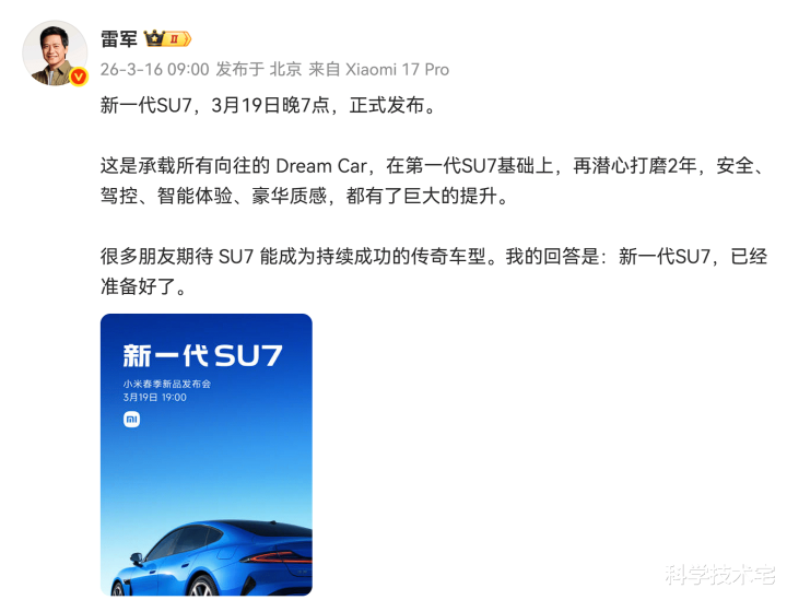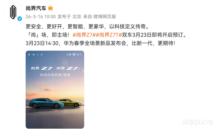 3 月 16 日 上昼 9 点,小米独创东谈主雷军官宣新一代小米 SU7 的发布信息——新一代小米 SU7 会在本月 19 日细腻发布;到了上昼 10 点,鸿蒙智行旗下的尚界品牌则是官宣 Z7 系列的预订预报,何况再次喊出了 “比新一代,更期待!” 的告白词。