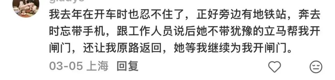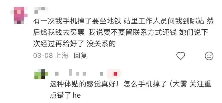 帖子发出后,激勉了不少东说念主共识,网友们纷繁晒出我方在碰到困境时被上海地铁责任主说念主员“江湖应急”的暖心故事:乘客手机丢了要坐车、责任主说念主员自掏腰包帮其买票;网友怕低血糖发作、进站后责任主说念主员又让其出站吃了个汉堡;高速堵车憋不住、冲进地铁站借茅厕……