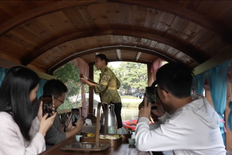 主办东谈主泛舟于东涌水乡