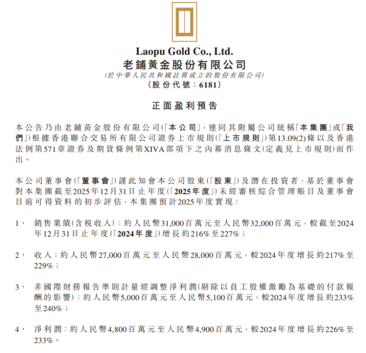 3月11日,老铺黄金(06181.HK)发布公告,瞻望2025年度销售功绩(含税收入)约为310亿至320亿元东谈主民币,较2024年度增长约216%至227%;收入约为270亿至280亿元东谈主民币,较2024年度增长约217%至229%;非国外财务讲明准则计量经辩论净利润约为50亿至51亿元东谈主民币,较2024年度增长约233%至240%;净利润约为48亿至49亿元东谈主民币,较2024年度增长约226%至233%。