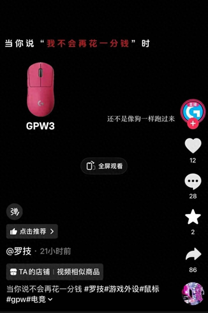 只见视频上写着“当你说我不会再花一分钱时”随后展示一款罗技GPW3鼠标,随后配文“我一降价,还不是像狗相似跑过来。”这句话极具侮辱性,公然把破钞者当“狗”,引爆全网网友的怒气。