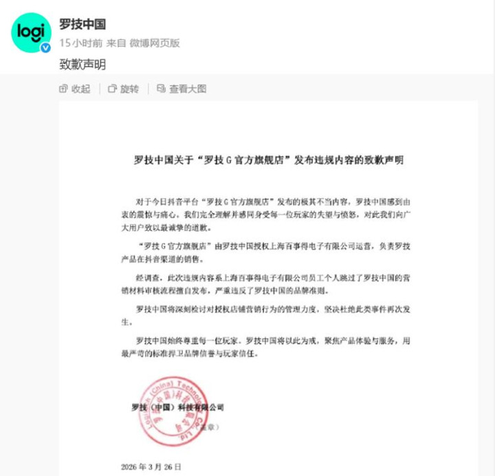 事情火速发酵,当晚11:15分,斗鱼体育app罗技中国发布了一份对于“罗技G官方旗舰店”发布违纪实质的致歉声明,可是看了,更让网友嗅觉到厌烦!