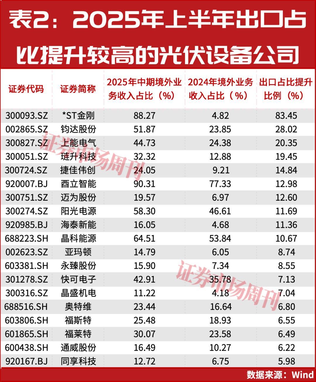 在光伏拓荒和电板行业,据Wind数据,现在申万光伏拓荒行业有70只因素股,其中2025年中期公布境外收入占比的公司达63家,艾罗动力、酉立智能、*ST金刚、阿特斯、晶科动力、阳光电源等公司的境外收入占比均达到50%以上。对比2024年末数据,上述63家公司中有39家的境外收入占比出现升迁,其中*ST金刚、钧达股份、上能电气、琏升科技、捷佳伟创辨认升迁了83.45、28.02、20.35、19.45、14.84个百分点。