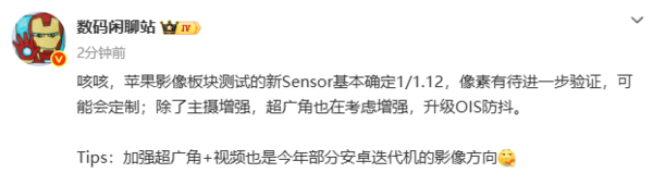 [CNMO科技音信]3月30日,数码博主“数码闲扯站”爆料称苹果影像板块当今正在测试的新Sensor基本细目为1/1.12英寸,天然具体的像素数仍有待考证,但这一尺寸本人已极具冲击力。