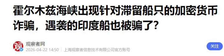 4月18日,伊朗方面一霎绽放这一海峡,明确示意船只禁受正规查验后即可通俗通行,这本是缓解航运压力、雄厚区域航运纪律的积极举措,可这短短刹那的通行窗口期,竟平直被一伙心想细密的糊弄分子盯上,尽心筹谋了一场针对航运公司的骗局。